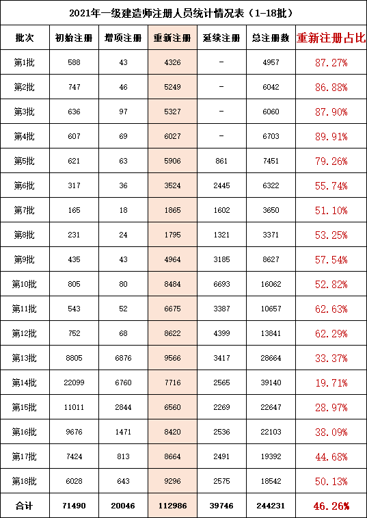 截止5月27日,2021年一级建造师注册人员人数合计244231人,其中初始注册人数合计:71490人、重新注册人数合计:112986人,重新注册占比46.26%。